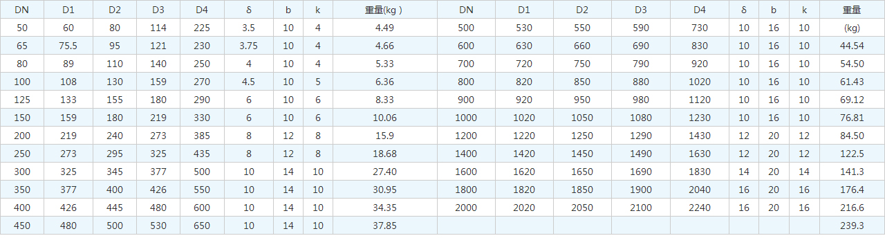 | DN | D1 | D2 | D3 | D4 | δ | b | k | 重量(kg) | DN | D1 | D2 | D3 | D4 | δ | b | k | 重量 |