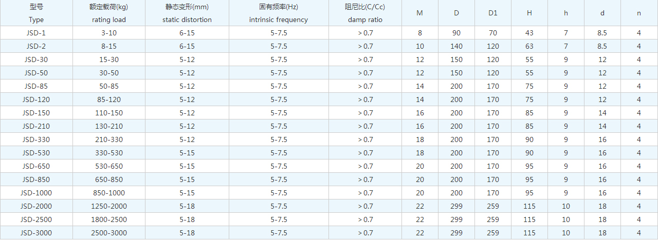 JSD型低頻橡膠隔振器等頻性好,當(dāng)大于額定載荷后,隔振器的固有頻率保持不變;阻尼比大,對(duì)共振峰的抑制能力強(qiáng);結(jié)構(gòu)簡(jiǎn)單、安裝方便,可直接安裝在機(jī)座下,同時(shí)也可用地基螺栓固定安裝,使用安全可靠。十四種規(guī)格,六種外形尺寸,載荷范圍為30N~25000N,耐油、海水、鹽、霧禾口日照等,適用于一25~+117℃溫度范圍。載荷范圍為額定載荷上下50%。