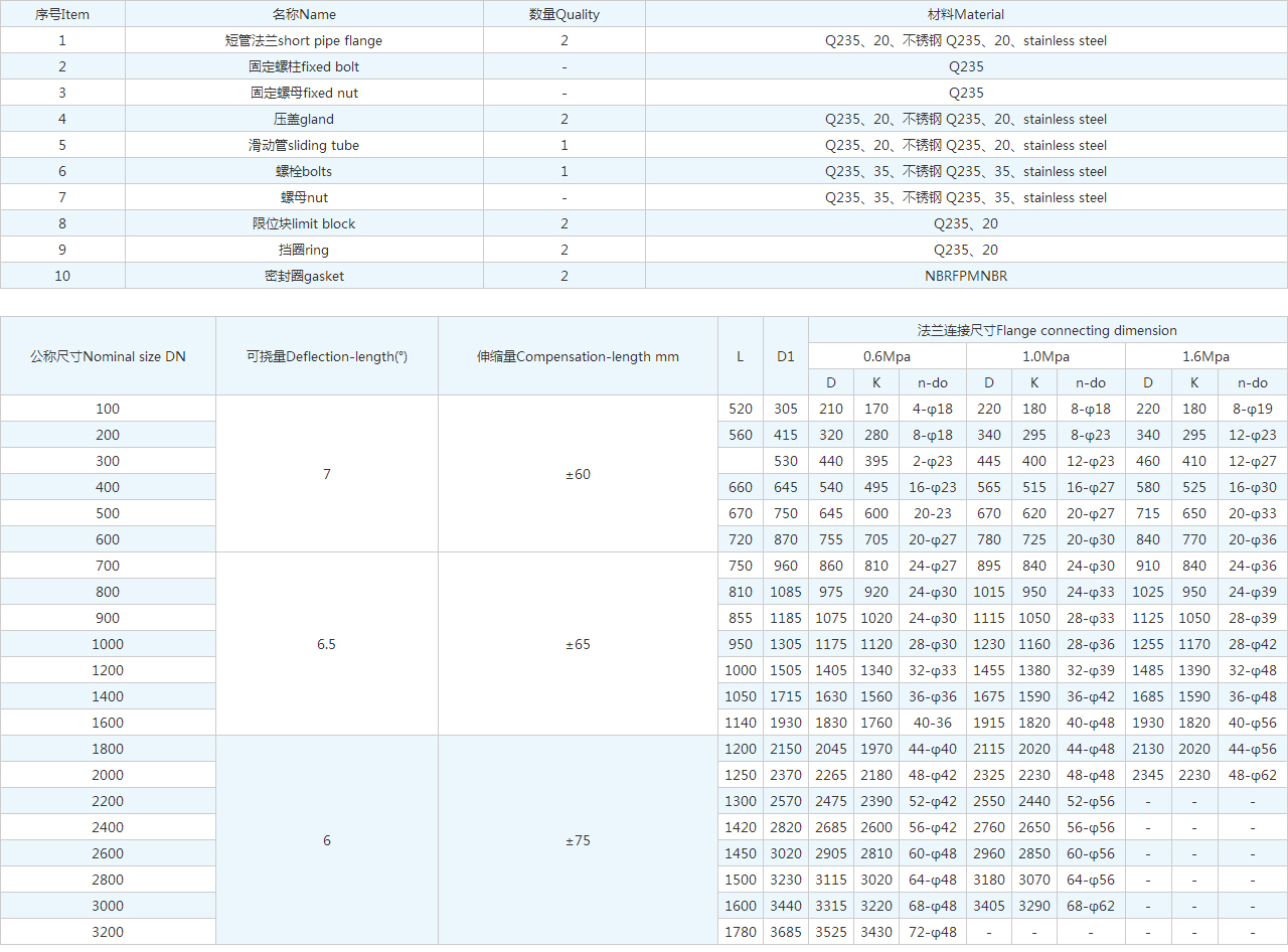 可撓量Deflection-length(°) | 伸縮量Compensation-length mm | L | D1 | 法蘭連接尺寸Flange connecting dimension | ||||||||