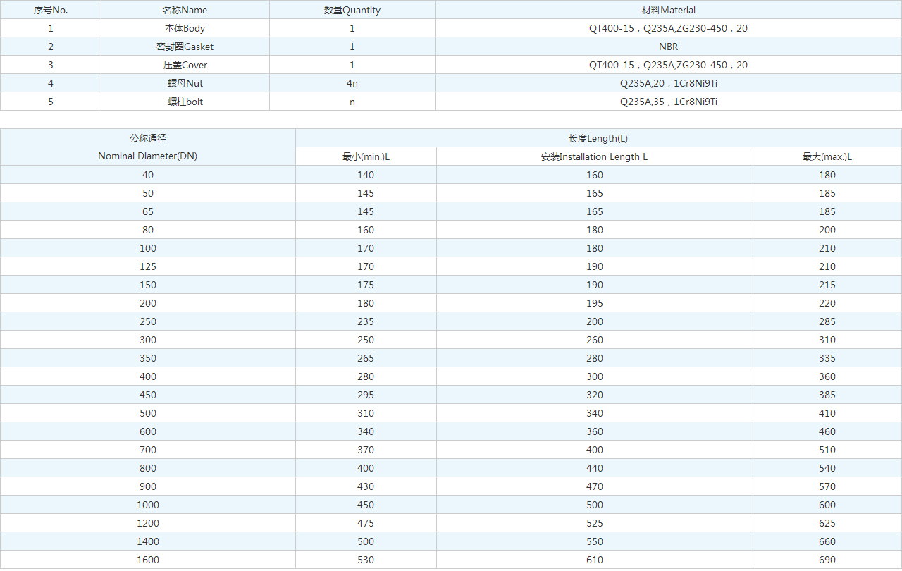 6. 套管式伸縮器該產(chǎn)品內(nèi)管材分為鑄鐵(HT)、鍍鋅(DX)和鋼制(SF)三種。法蘭連接尺寸采用9115.1-2000標(biāo)準(zhǔn);