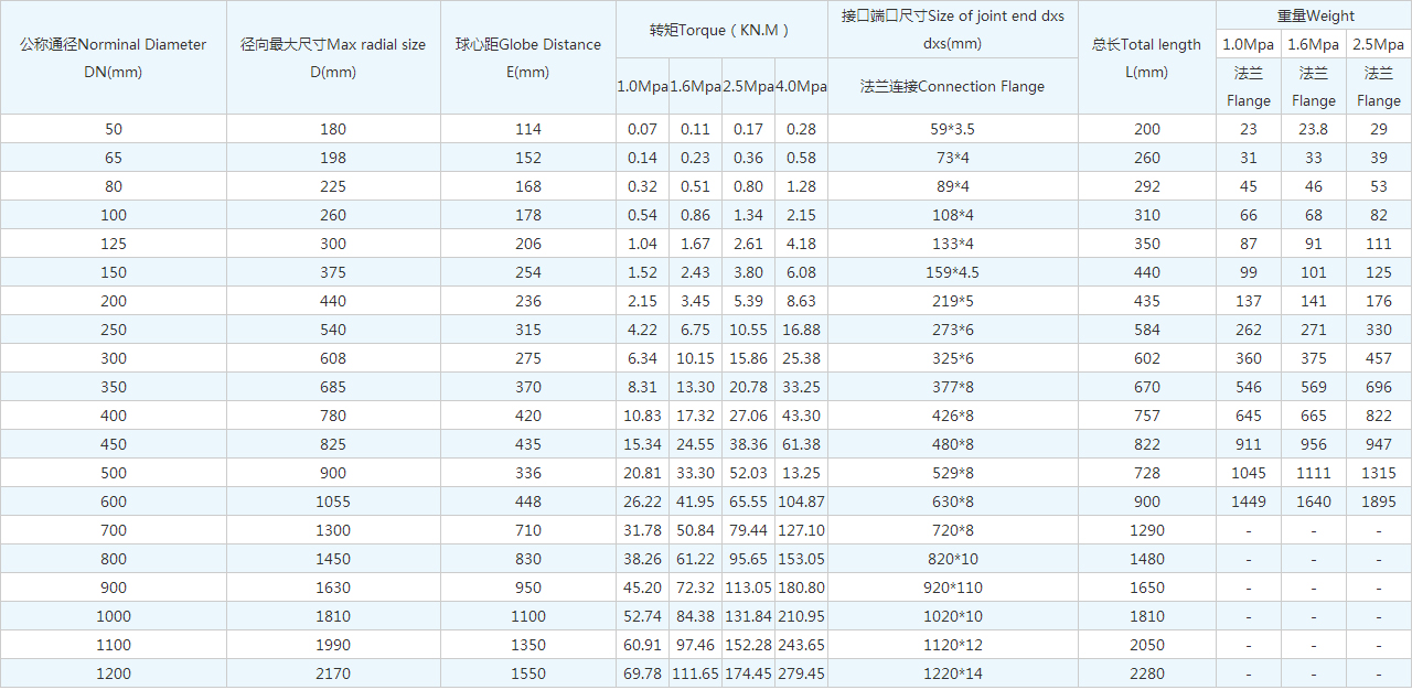 | 公稱通徑Norminal Diameter DN(mm) | 徑向很大尺寸Max radial size D(mm) | 球心距Globe Distance E(mm) | 轉(zhuǎn)矩Torque(KN.M) | 接口端口尺寸Size of joint end dxs dxs(mm) | 總長Total length L(mm) | 重量Weight | |||||
