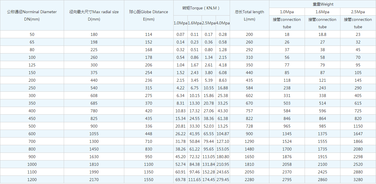 | 公稱通徑Norminal Diameter DN(mm) | 徑向很大尺寸Max radial size D(mm) | 球心距Globe Distance E(mm) | 轉(zhuǎn)矩Torque(KN.M) | 總長Total length L(mm) | 重量Weight | |||||