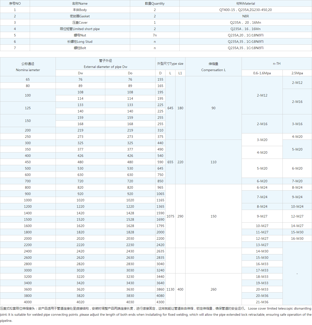 壓蓋式松套限位伸縮接頭:該產(chǎn)品適用于管道連接處呈焊接結(jié)構(gòu),安裝時(shí)調(diào)整產(chǎn)品兩端連接長度,進(jìn)行焊接固定,這樣就能讓管道自由伸縮,鎖定伸縮量,確保管道的安全運(yùn)行。 Loose cover limited telescopic dismantling joint: it is suitable for welded pipe connecting points ,please adjust the length of both ends when installating for fixed welding, which will allow the pipe extended lock retractable, ensuring safe operation of the pipeline.