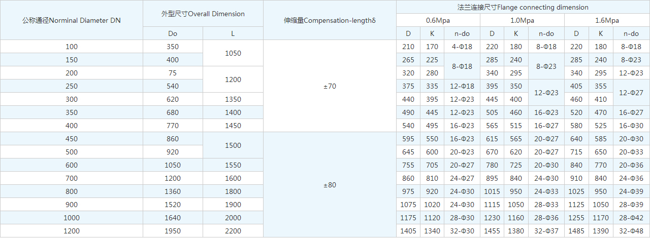 | 公稱通徑Norminal Diameter DN | 外型尺寸Overall Dimension | 伸縮量Compensation-lengthδ | 法蘭連接尺寸Flange connecting dimension | |||||||||